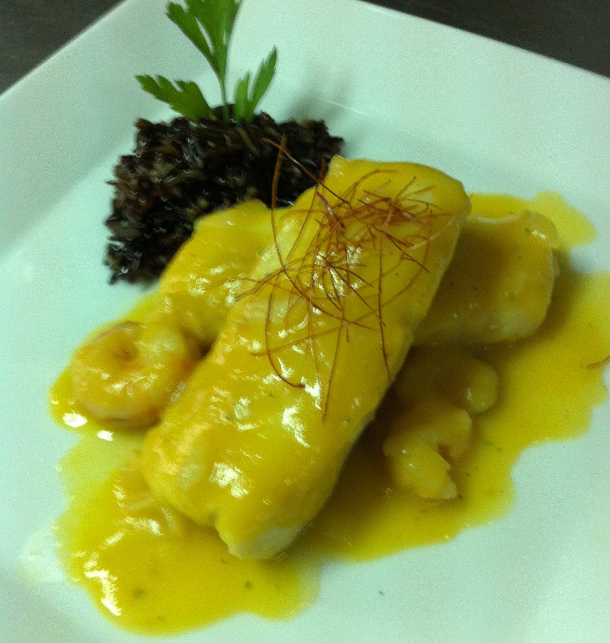 - Lomos de merluza asada con salsa de calabaza y langostinos (ver foto)